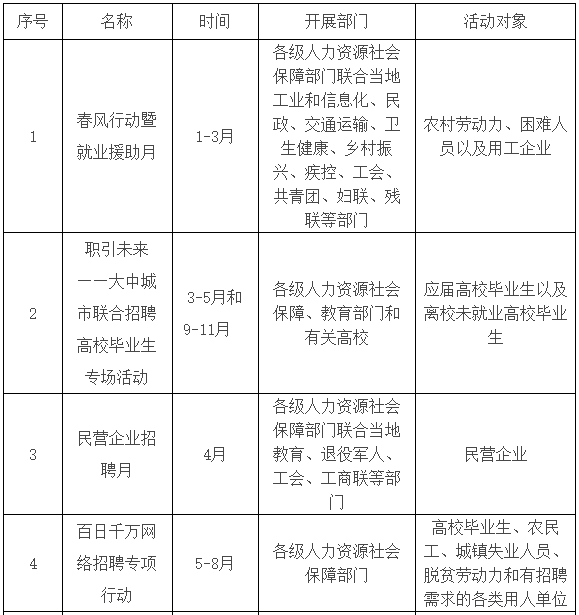 (一)春風(fēng)行動(dòng)暨就業(yè)援助月。1-3月,以轄區(qū)內(nèi)農(nóng)村勞動(dòng)力、困難人員以及用工企業(yè)為服務(wù)對象,由各級(jí)人力資源社會(huì)保障部門聯(lián)合當(dāng)?shù)毓I(yè)和信息化、民政、交通運(yùn)輸、衛(wèi)生健康、鄉(xiāng)村振興、疾控、工會(huì)、共青團(tuán)、婦聯(lián)、殘聯(lián)等部門開展,在元旦春節(jié)期間集中為服務(wù)對象開展引導(dǎo)有序外出就業(yè)、就近就業(yè)創(chuàng)業(yè)、兜底安置等就業(yè)幫扶。