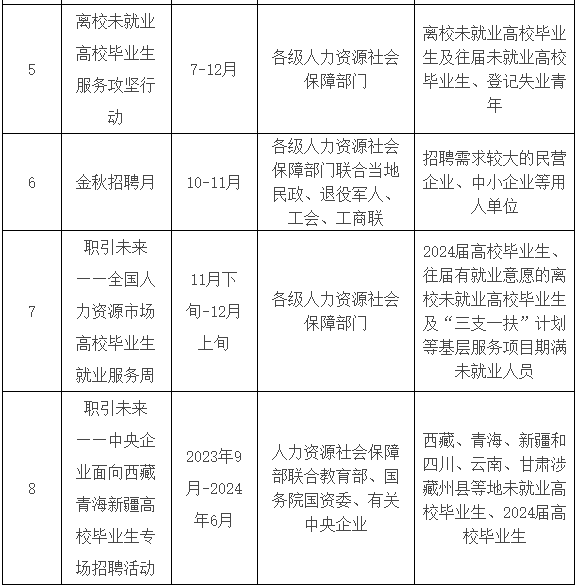 (八)職引未來——中央企業(yè)面向西藏青海新疆高校畢業(yè)生專場招聘活動(dòng)。2023年9月-2024年6月,以西藏、青海、新疆和四川、云南、甘肅涉藏州縣等地未就業(yè)高校畢業(yè)生、2024屆高校畢業(yè)生為重點(diǎn)對象,由人力資源社會(huì)保障部聯(lián)合教育部、國務(wù)院國資委、有關(guān)中央企業(yè)開展,舉辦專場招聘活動(dòng)。