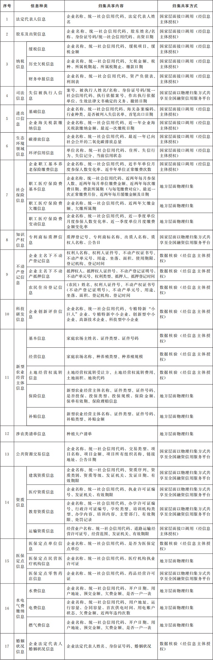 (四)明確信用信息歸集共享范圍。根據(jù)金融機(jī)構(gòu)對信用信息的實(shí)際需求,進(jìn)一步擴(kuò)大信用信息歸集共享范圍,將企業(yè)主要人員信息、各類資質(zhì)信息、進(jìn)出口信息等納入信用信息歸集共享清單(見附件),國家發(fā)展改革委牽頭適時對清單進(jìn)行更新。各地區(qū)要充分發(fā)揮地方融資信用服務(wù)平臺作用,進(jìn)一步破除數(shù)據(jù)壁壘,依法依規(guī)加大清單外信用信息歸集共享力度,結(jié)合本地區(qū)實(shí)際編制省級信用信息歸集共享清單,有效拓展數(shù)據(jù)歸集共享的廣度與深度。