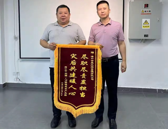 為感謝海口會展工場在園區(qū)臺風(fēng)過后重修重建工作的積極配合和幫助,9月29日,??谑校ń苠\)人力資源產(chǎn)業(yè)園總經(jīng)理劉昕暉特代表園區(qū)全體向??跁构鲑浰湾\旗。